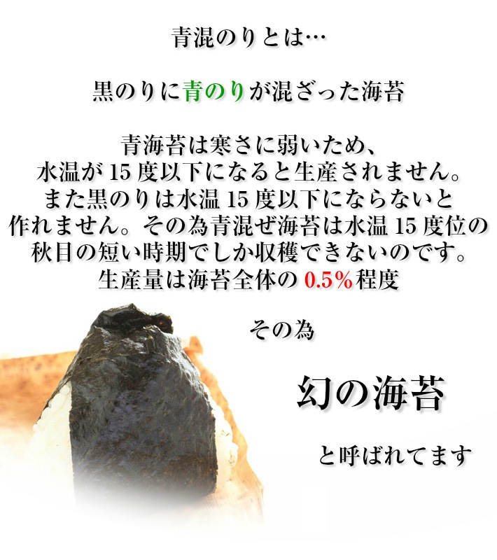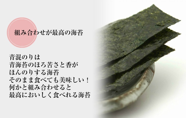 ~メディアで多数紹介、極上初摘み!!幻の海苔~ 愛知県三河湾で採れる青混のりは極上で全国的にも評判が高く、生産量は海苔全体の0.5%程度と言われています。青混ぜのり特有のほろ苦さと磯の香りが感じることができ、そのままでも美味しく召し上がっていただきます。