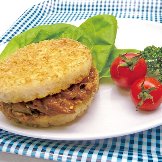醤油の風味にこだわった自家製ダレで焼いた牛肉をこんがり焼いたごはんでサンドしました。