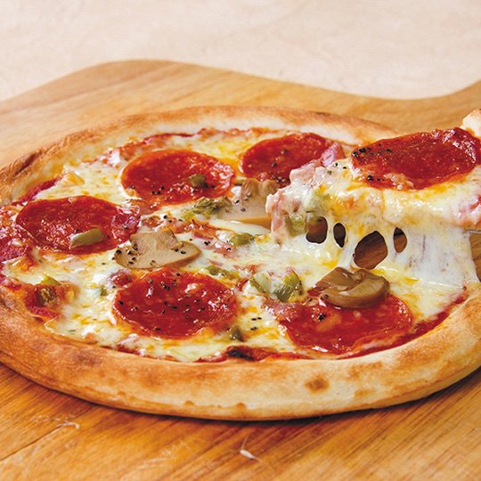パリッともちもちのナポリ風クラストを使用。ジューシーなトマトソースをベースにコクと旨みのナチュラルチーズとスパイシーなペパロニソーセージ、ベーコン、マッシュルーム、ブラックペッパーをトッピング。