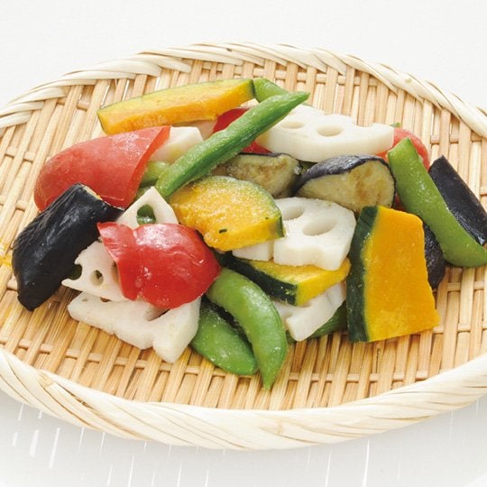 かぼちゃ(中国)、れんこん(中国)、スナップえんどう(中国)、揚げなす(中国)(なす、植物油脂)、赤パプリカ/ミョウバン(一部に大豆を含む)