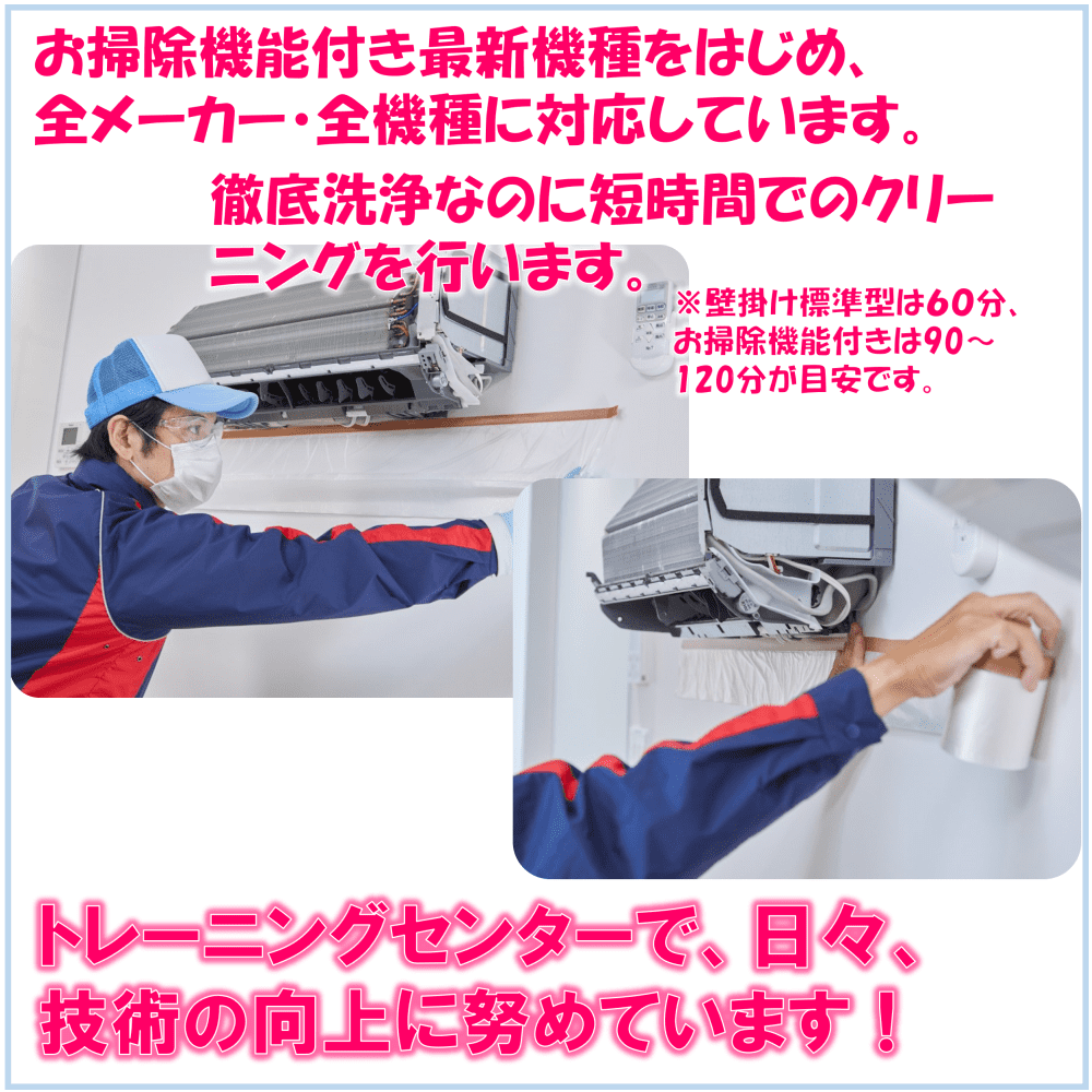 カビやホコリを徹底的にクリーニングするプロの分解洗浄技術は、不快なニオイを取り除き、熱交換率を上げ「電気代の節約」や「冷暖房効率のUP」の効果があります。 トレーニングセンターで、日々技術の向上に努めており、全メーカー・全機種に対応しています!