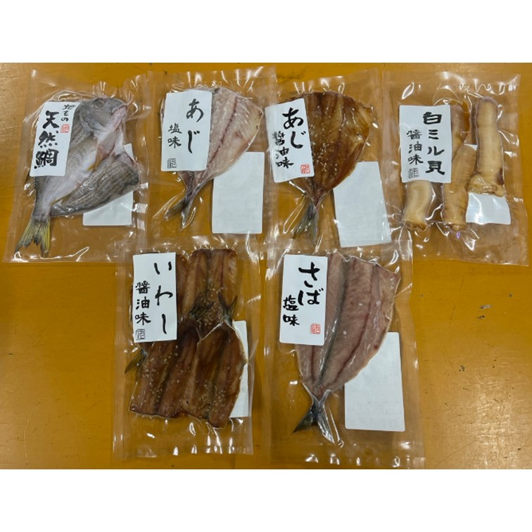 商品内容 長崎県産あじ塩・長崎県産あじ醤油・愛知県産いわし・愛知県産さば・愛知県産たい・愛知県産白ミル貝