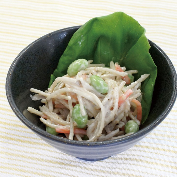 大豆で作った大豆マヨネーズ使用。皮付のごぼうをブレンドすることにより、ごぼうの風味を生かしました。ごぼうは細切りで、上品な見た目です。