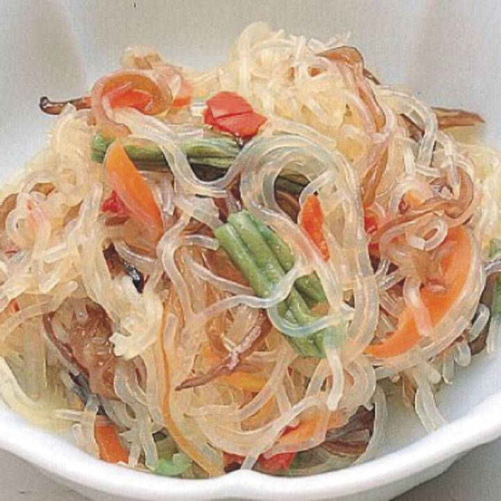 ラー油のピリ辛味がアクセントになっています。春雨と木耳、人参、山くらげ、赤ピーマンを彩り良く混ぜ合わせました。春雨を食べやすく盛りつけやすいサイズにカットした小付けに重宝な一品です。