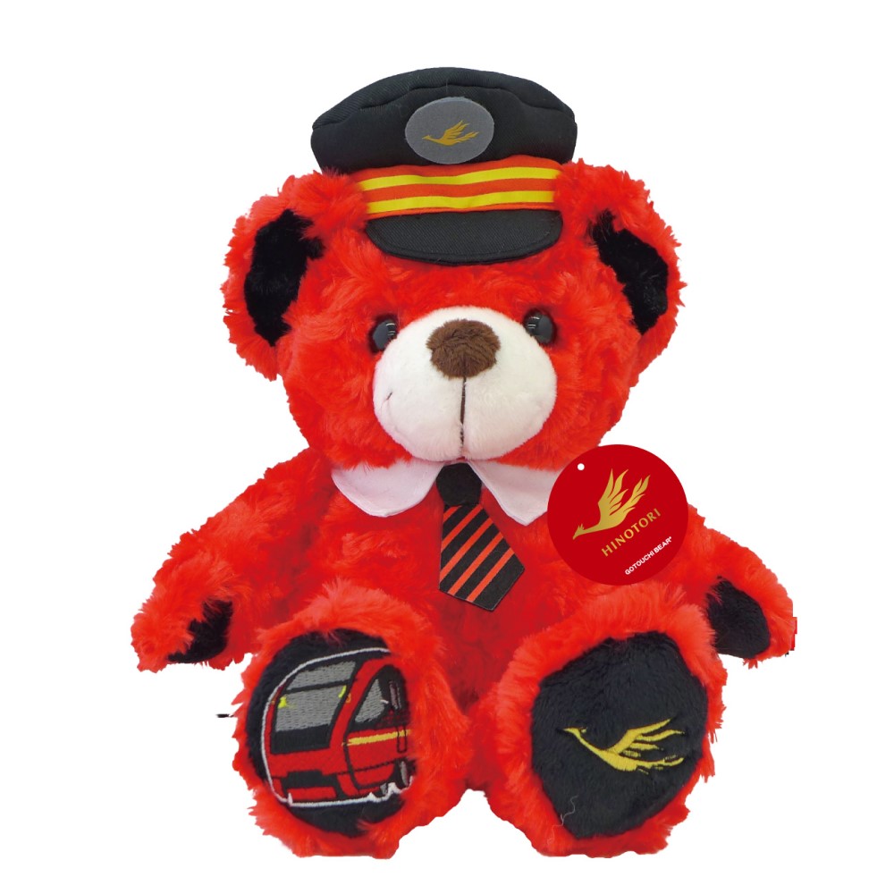 深い艶感のあるメタリックレッドの外観デザインが特徴で、ご当地ベアも鮮やかなレッドに「ひのとり」のロゴを配した制帽スタイルになっています。