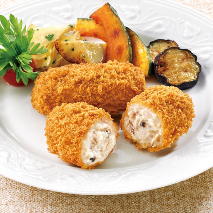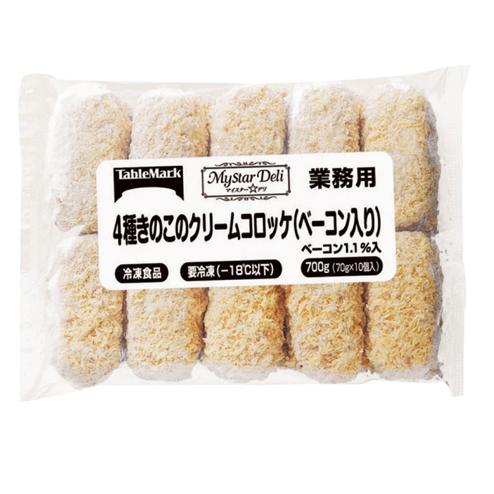 牛乳(国内製造)、野菜(たまねぎ、にんにく)、マッシュルーム、ぶなしめじ、まいたけ、小麦粉、生クリーム、植物油脂、エリンギ、ベーコン、マーガリン、砂糖、チキンエキス調味料、豚コラーゲン、酵母エキス、しいたけエキスパウダー、野菜ブイヨンパウダー、食塩、衣〔パン粉(国内製造)、でん粉、小麦粉、粉末水あめ、粉末油脂、食塩、粉末状植物性たん白、卵黄粉〕/加工デンプン、トレハロース、調味料(アミノ酸等)、乳化剤、貝Ca、酸味料、カゼインNa、リン酸塩(Na)、増粘多糖類、くん液、酸化防止剤(V.C)、着色料(カロチノイド、コチニール)、甘味料(スクラロース)、発色剤(亜硝酸Na)、香料、香辛料抽出物、(一部に小麦・卵・乳成分・大豆・鶏肉・豚肉を含む)